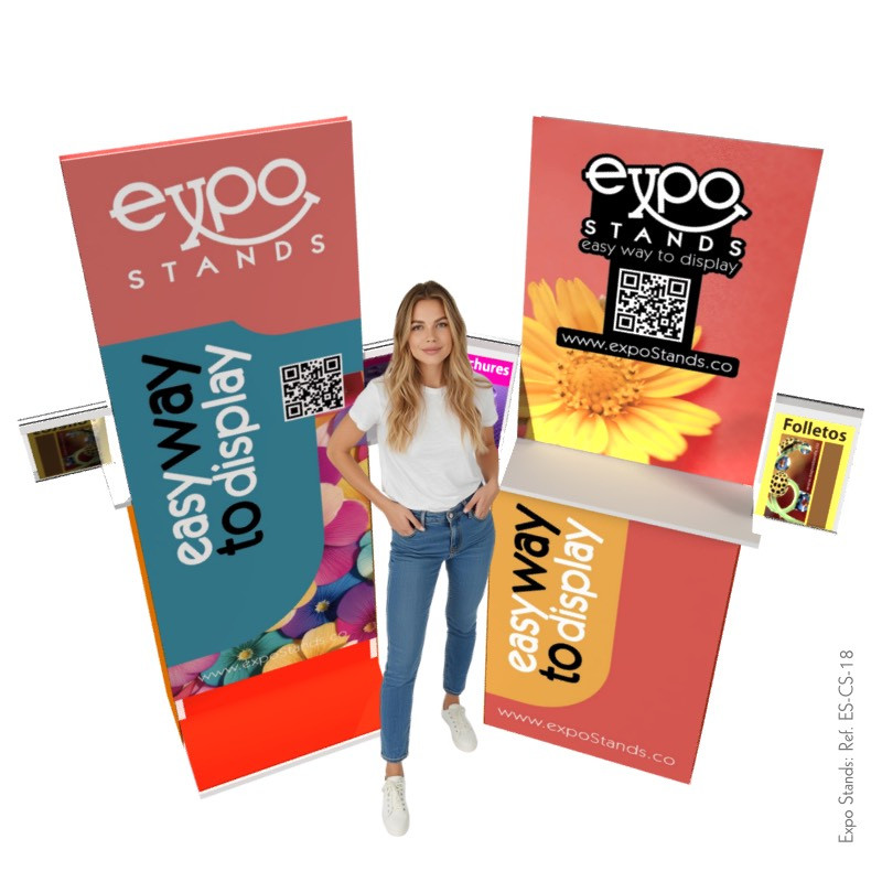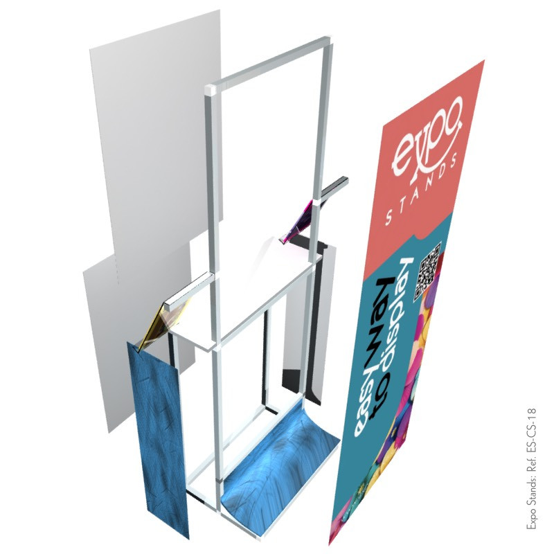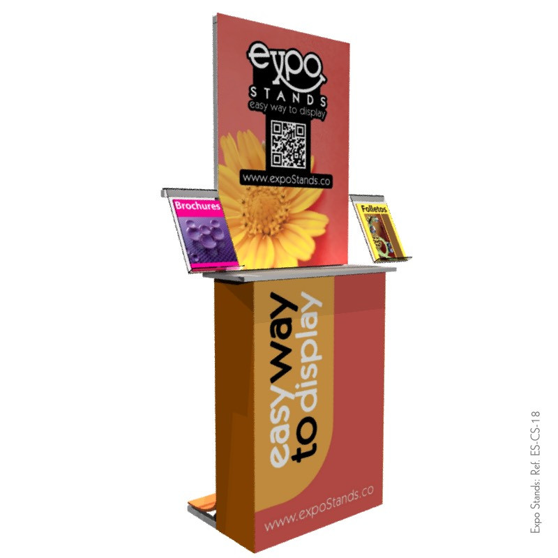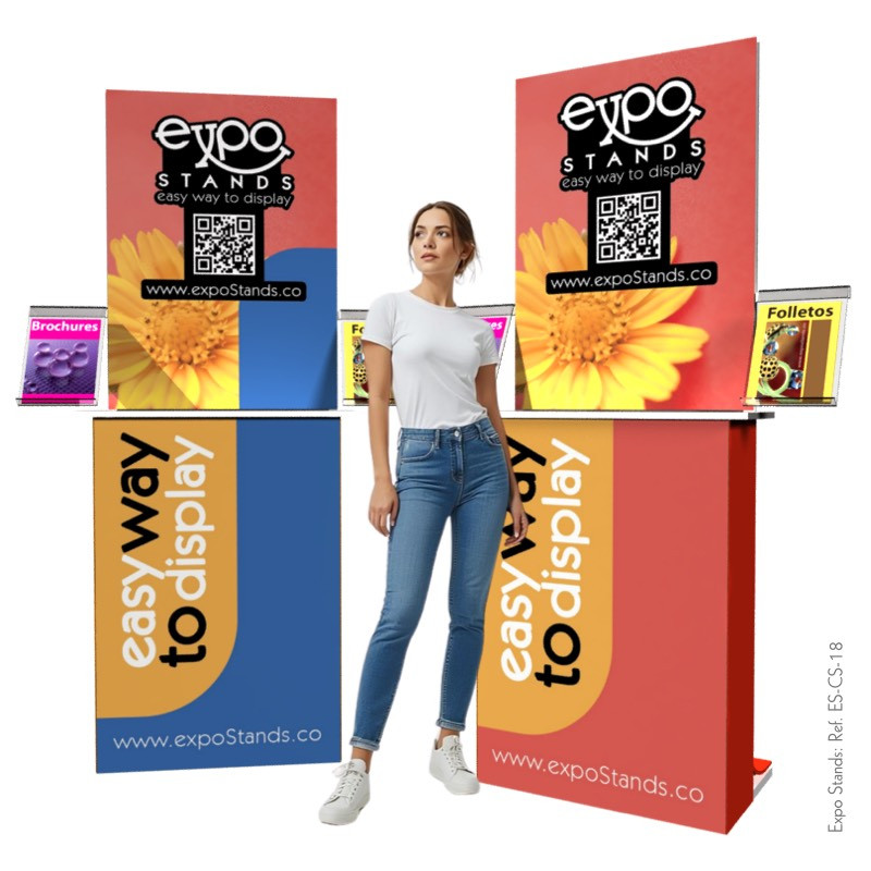 El sistema Expo Stand Ref. ES-CS-18 es un Display (Backing + counter + porta folletos) portátil, Punto de venta y atención itinerantes con porta folletos doble.