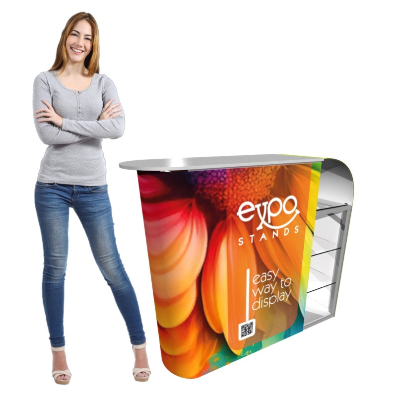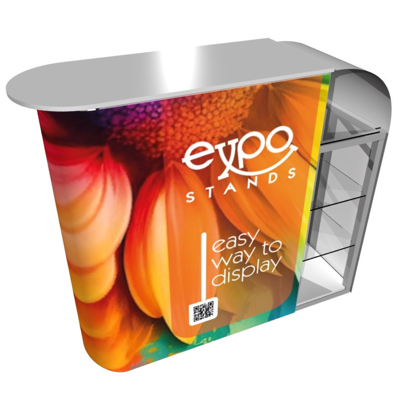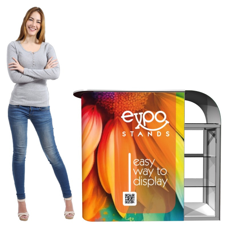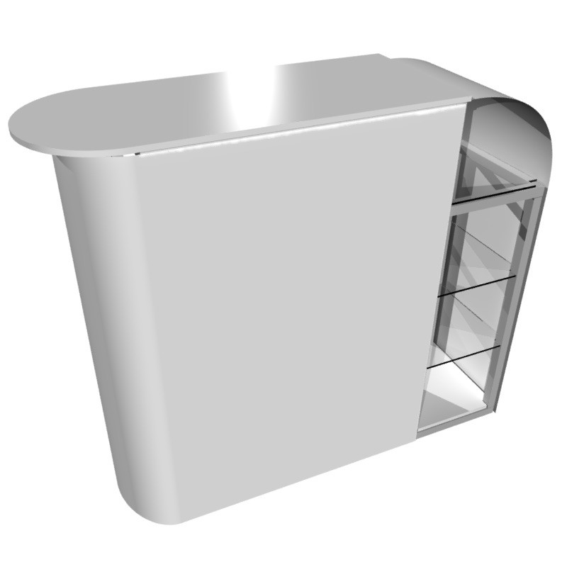 El counter con repisa lateral de ExpoStand, Ref. ES-C-R-9040 es un sistema de diseño moderno, orgánico, concebido para la exhibición, demostración y venta de productos y servicios.