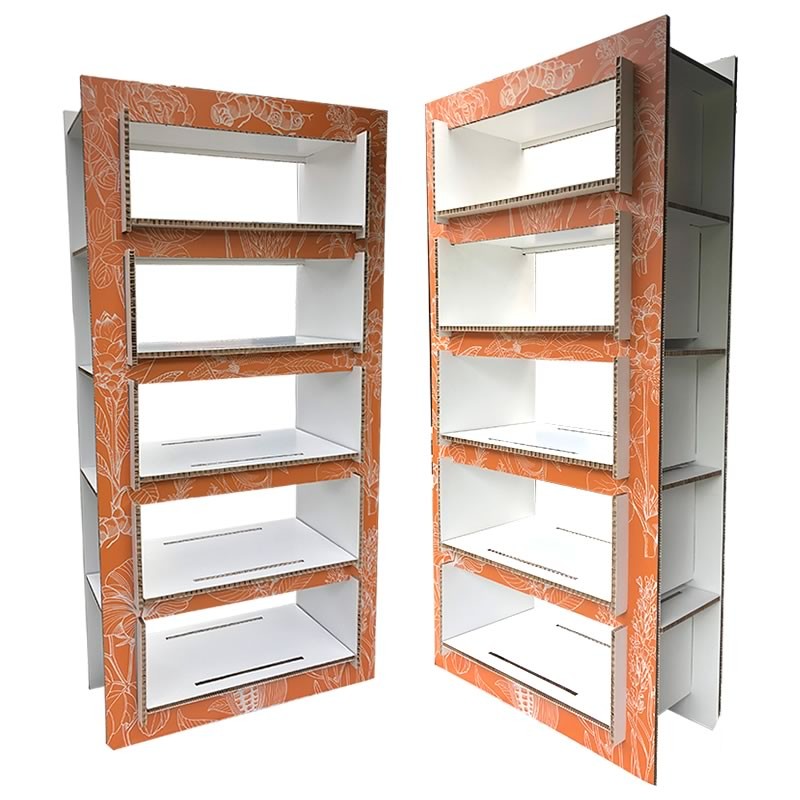 Ref. EcS-ExR-100200-5 - Repisa exhibidor de cartón tipo panal. Un gran mueble diseñado para exhibir productos y prendas.