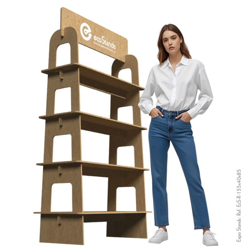 La repisa Eco Stand Ref. EcS-R-155x40x85 es un mobiliario desarmable, semiportable, elaborado en MDF. Es ideal para exhibición de productos y prendas de vestir en ferias, eventos, puntos de venta itinerantes.
