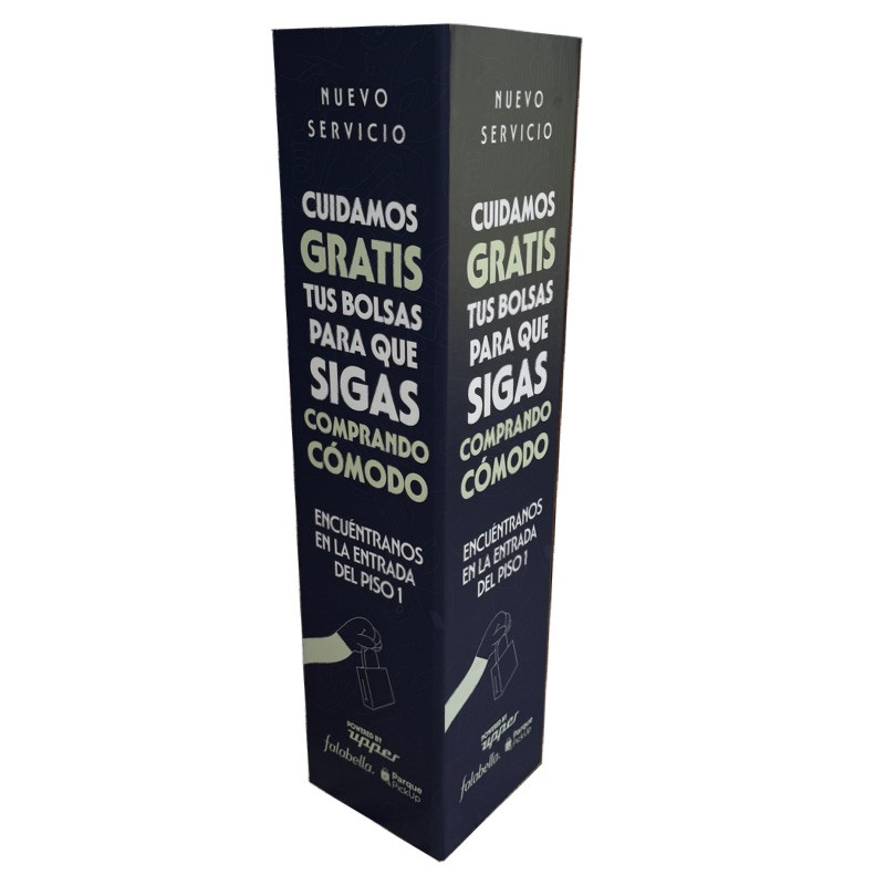 El tótem en cartón Ref. EcS-TTM-C8-002A de 25 cm de ancho por 100 cm (1,0 mts) de altura es un producto fácil de armar. Solo basta con retirar los protectores adhesivos y unir las pestañas a la estructura.